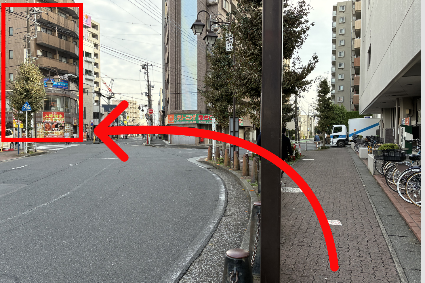 5道沿いに進むと建物が見えてきます。