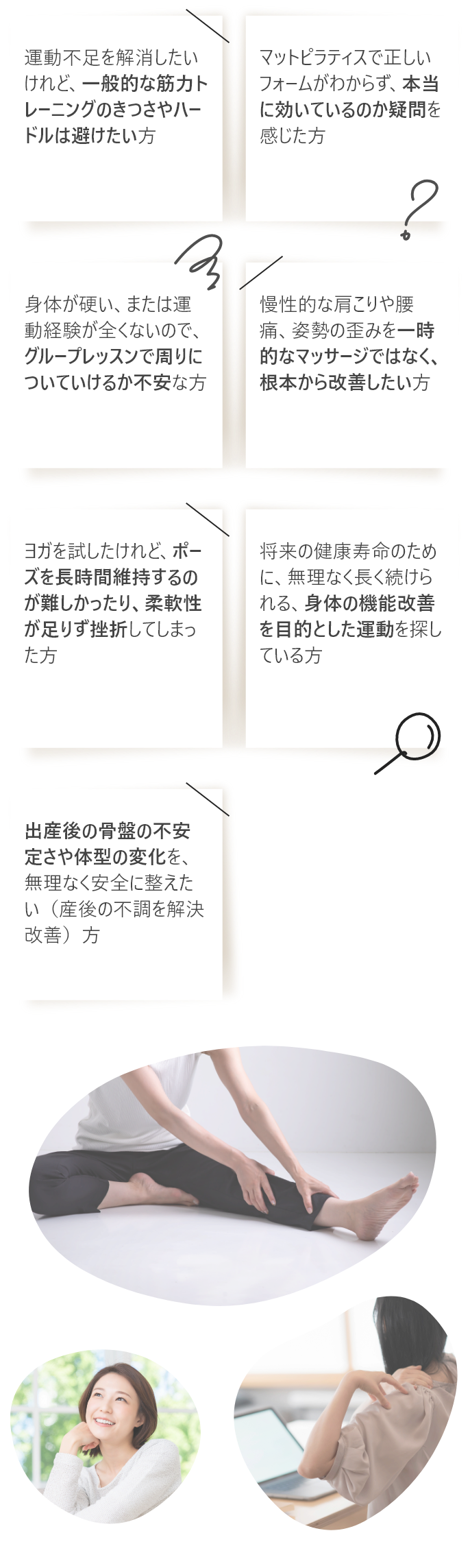 効率的に身体の不調を改善したい方や、運動初心者の方は、あなたの身体に真剣に向き合い、オーダーメイドのレッスンを1対1で提案してくれるスタジオを選ぶことをおすすめします。 -